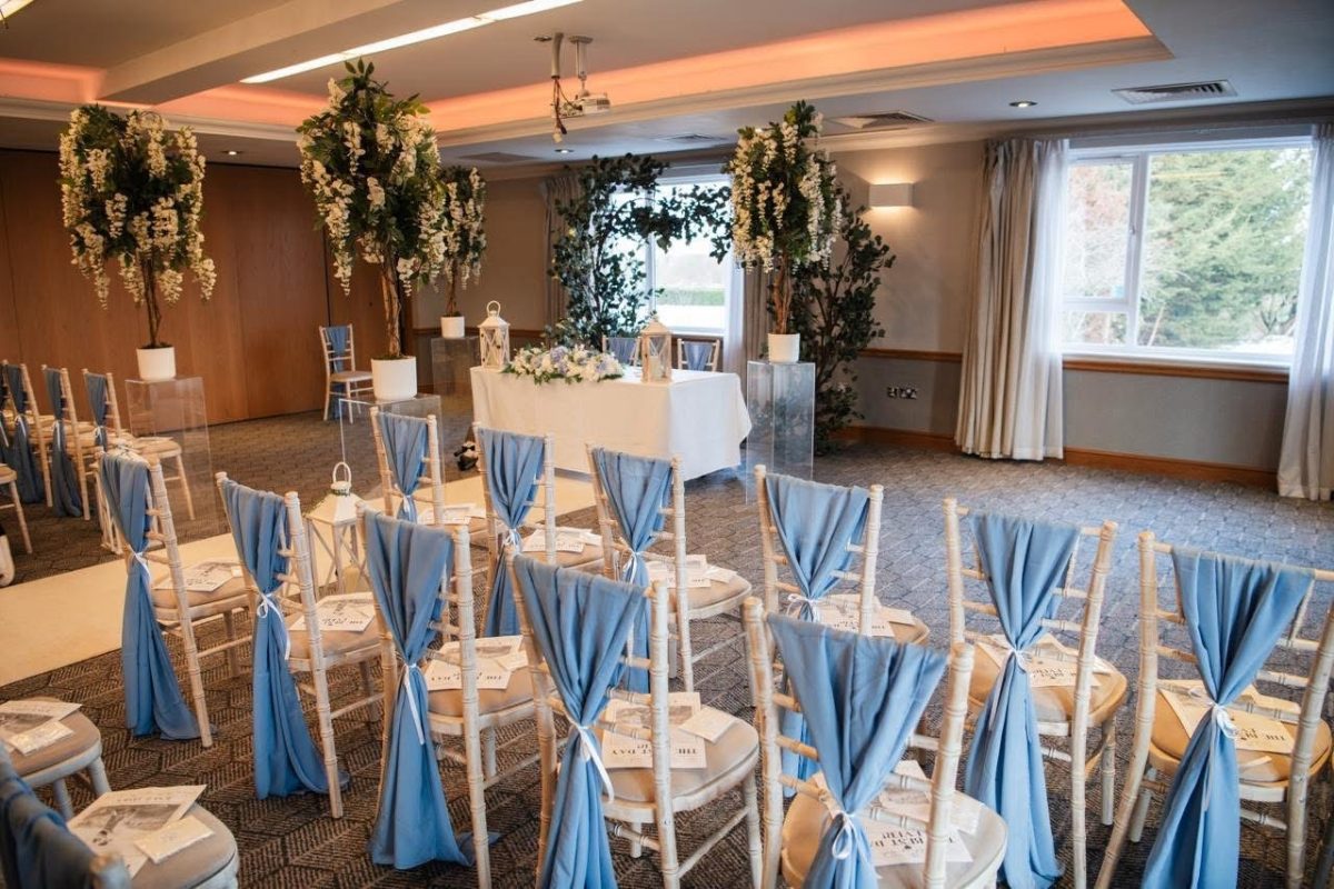 This elegant blue and white wedding at the Cottons Hotel and Spa in Knutsford showcases timeless styling bespoke wedding hire and classic décor for Cheshire weddings. #bespokewedding #planningawedding #blueandwhitewedding #duskyblue #duskybluewedding #palebluewedding #moongates #wisteriatrees #aisledecor #cottonshotelandspa #cottonshotel #weddingplanning #weddinghire